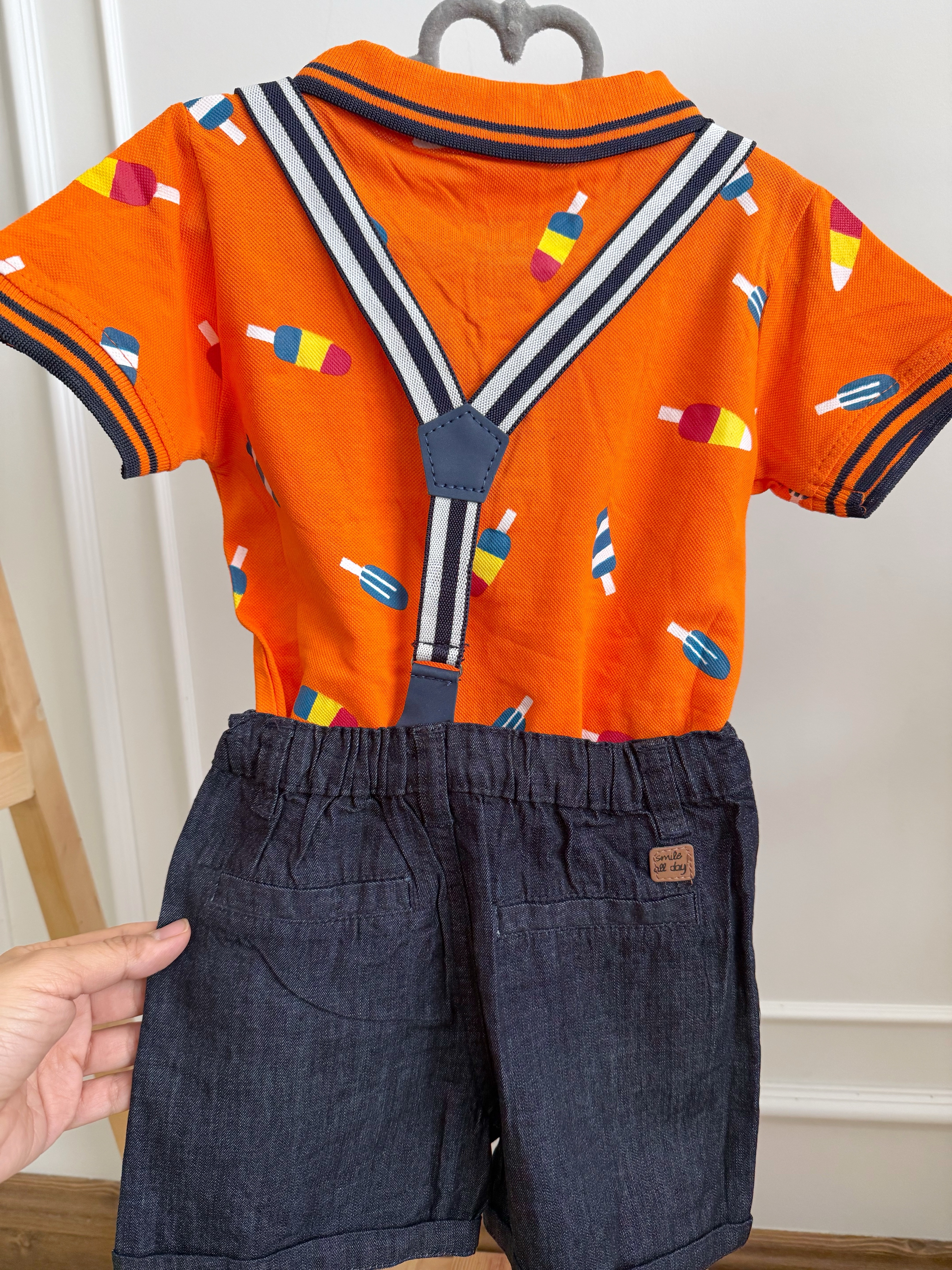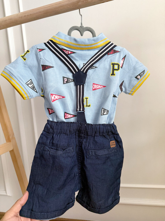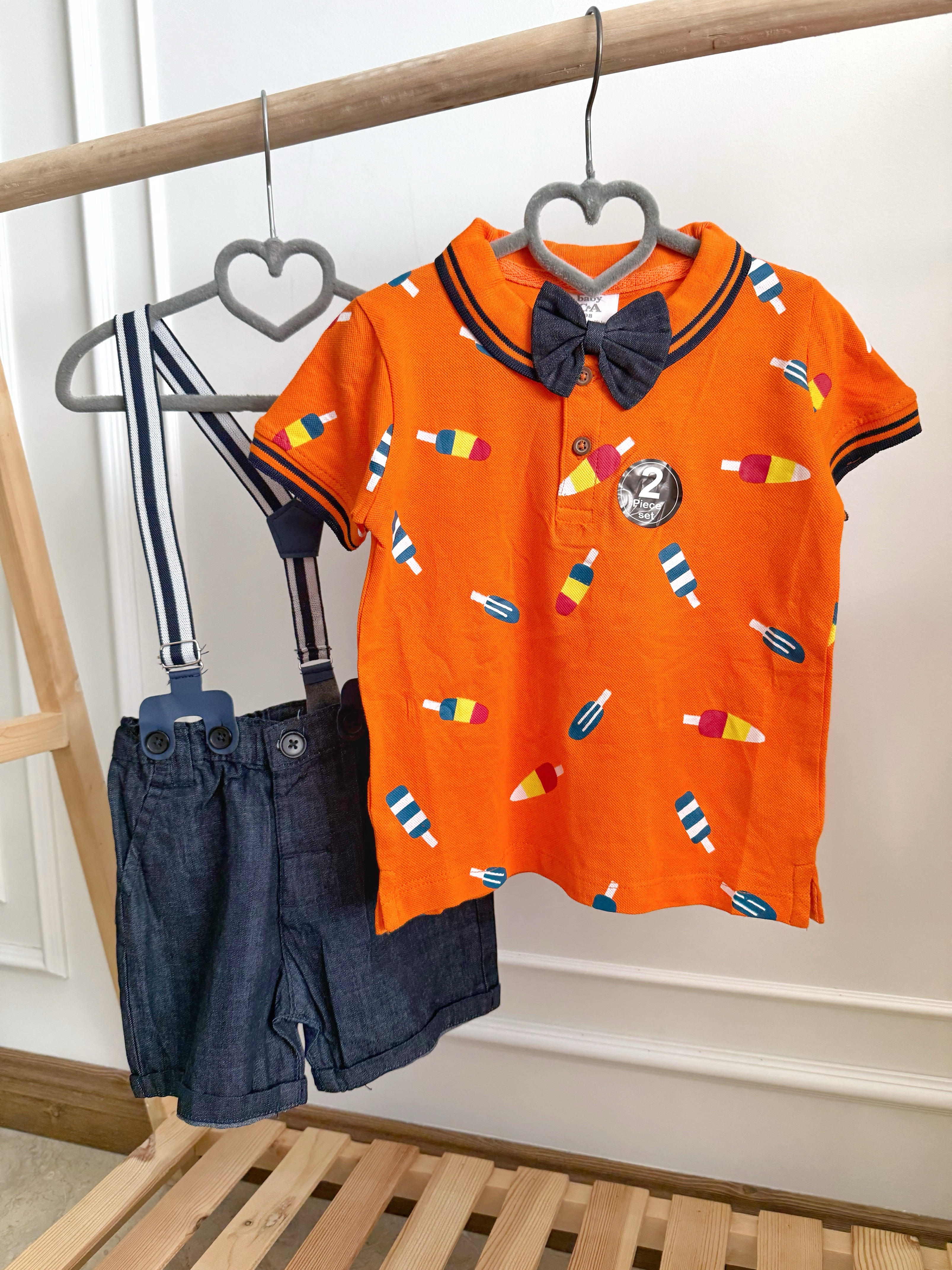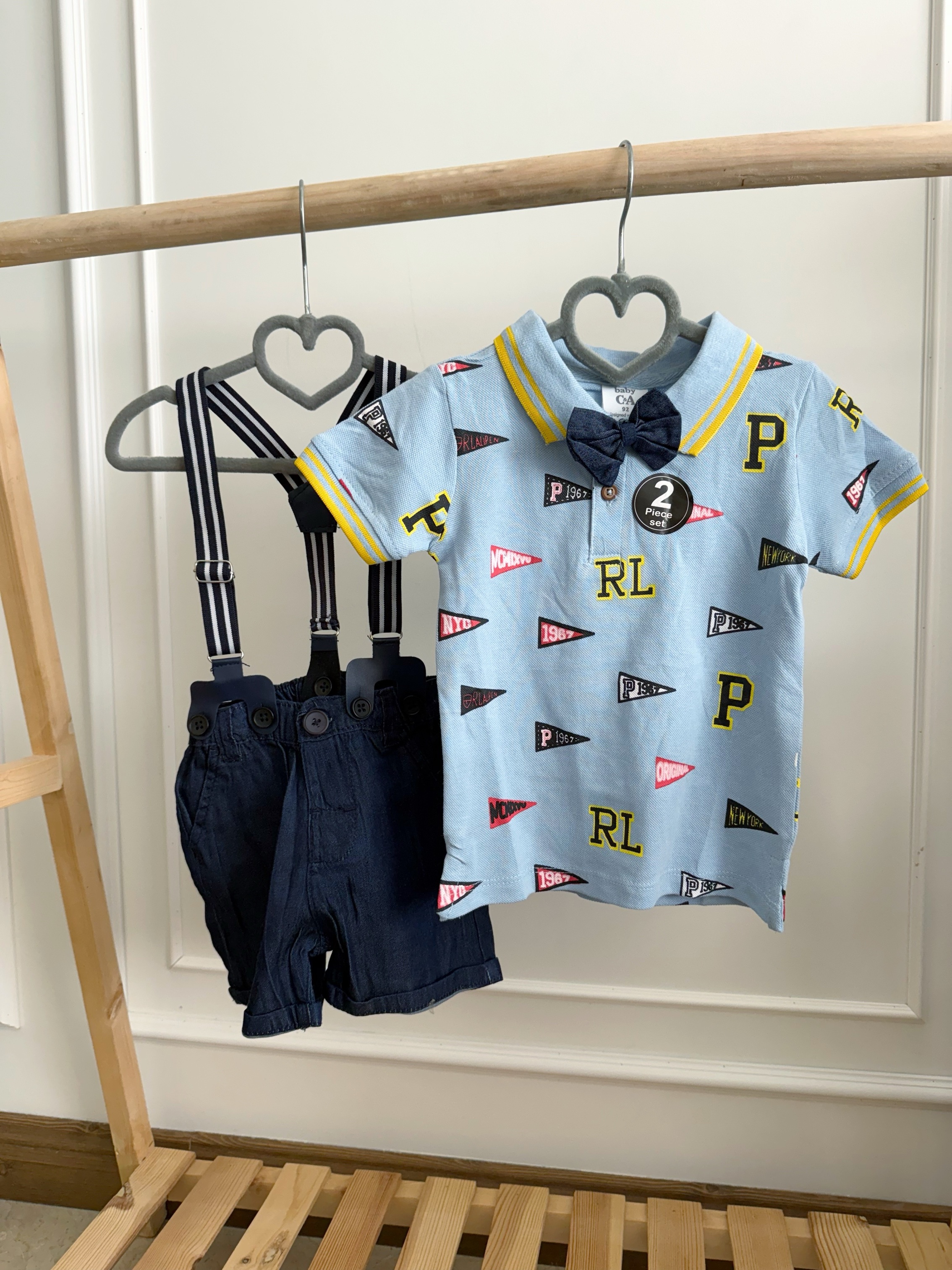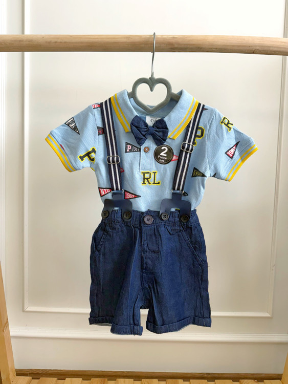 - **پک کامل شامل:** تیشرت پولوشرت، شلوارک کتان نخی، ساسبند کشی قابل تنظیم و پاپیون ست.